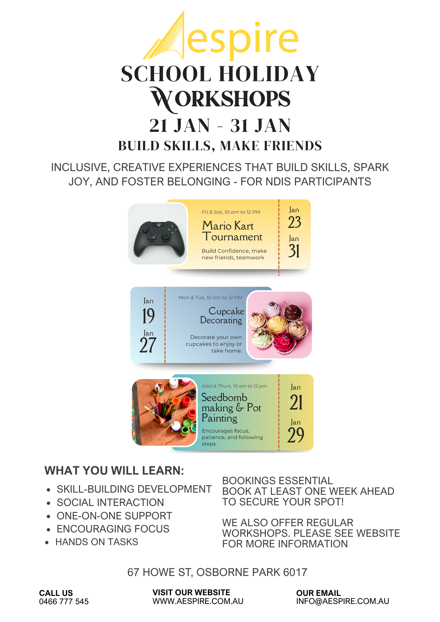 Join our inclusive, hands-on workshops designed to build creativity, confidence, and connection. All activities support NDIS goals under Increased Social and Community Participation.